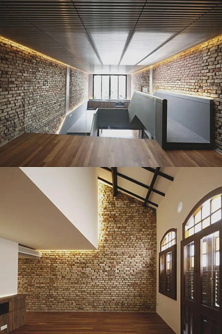 The restoration carefully preserved the original brick structural walls of this heritage shophouse, maintaining its historical integrity while completely reimagining the interior layout. A modern glass roof, thoughtfully shielded by architectural beams, replaced the original structure, flooding the interior with natural daylight and creating an airy, contemporary atmosphere within the historic shell.
