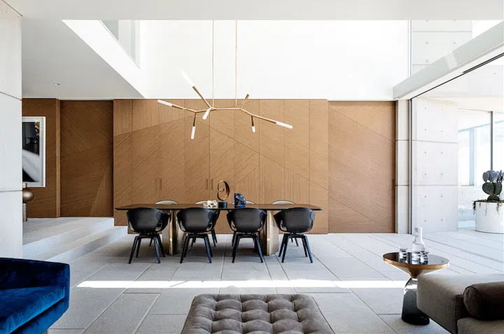 Warm, natural hues infuse the living and dining areas to augment the open, outdoor feel. The dining table was custom designed by Alexandra Kidd Design and manufactured by MSA Prestige Woodcraft.