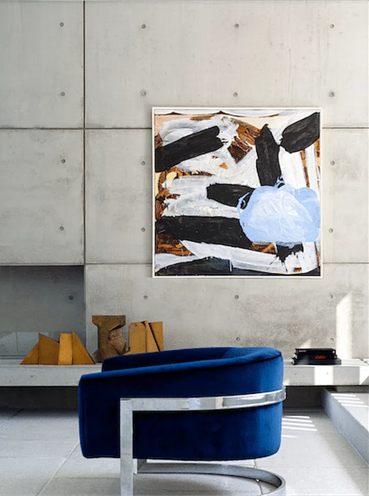 A mix of luxurious seating lends the living room a chic, eclectic vibe. Cobalt blue vintage Milo B armchairs reupholstered by 1st Dibs serve as dramatic foil to the tan Flexform Wing sofa.
