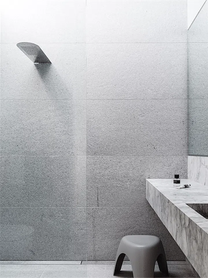 The children’s bathroom features chic concrete walls and flamed granite flooring. An Elephant stool by Sori Yanagi for Vitra completes the look.