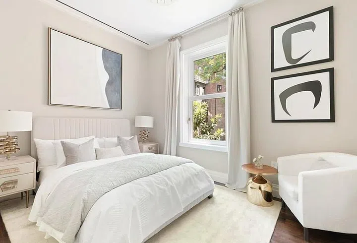 In its new iteration, the living rooms in the townhouse are bathed in a creamy palette. Accented by beige curtains, the rooms feel spacious and open.