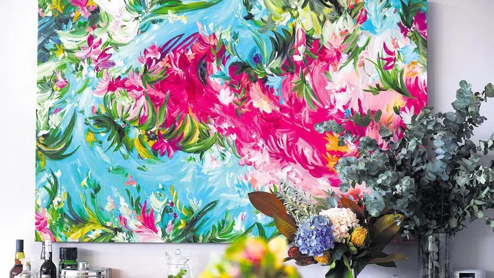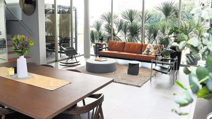 Greenery dominates the rest of the home, from the tall standing plants in the balcony to the various floral arrangements on the side console and dining table, giving the apartment a tropical feel. A floral artwork on the wall by Australian abstract artist Amber Gittins adds a colourful touch to the dining area.