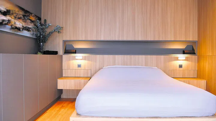 The couple’s bedroom is on the upper floor, where they have chosen a light coloured palette to give the room a relaxed feel. As there wasn’t enough storage space in the original layout, they added a row of cupboards and turned the area into a walk-in wardrobe.