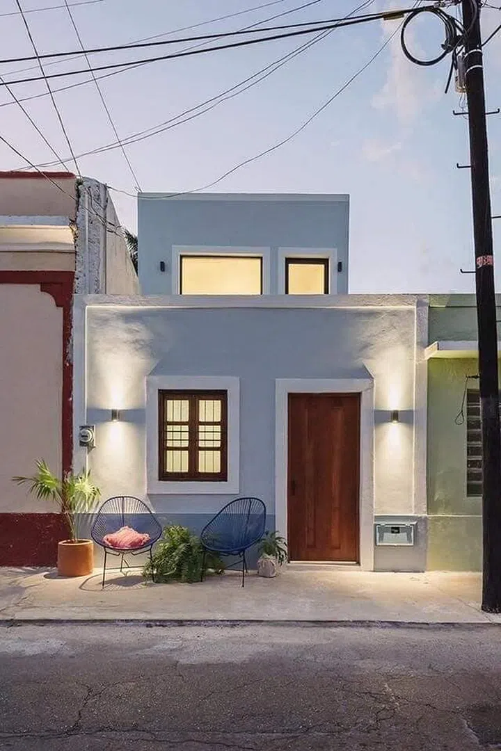 The double-storey facade at the front of the house actually opens up to a living space, which leads onto a deck with a lap pool!
