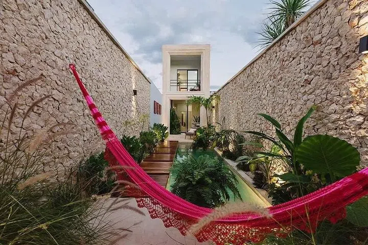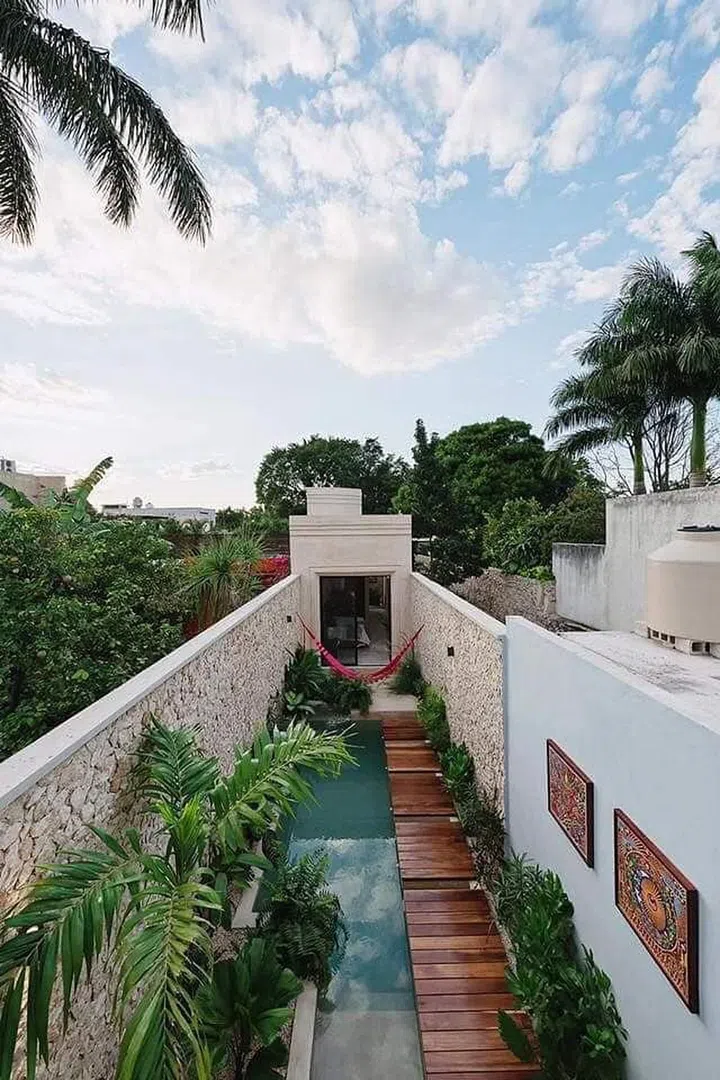 Wooden decking line the side of the lap pool, while cosy outdoor furniture add a touch of style on both ends of the pool. On the opposite side lies another complex housing the master bedroom and bathroom.