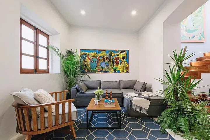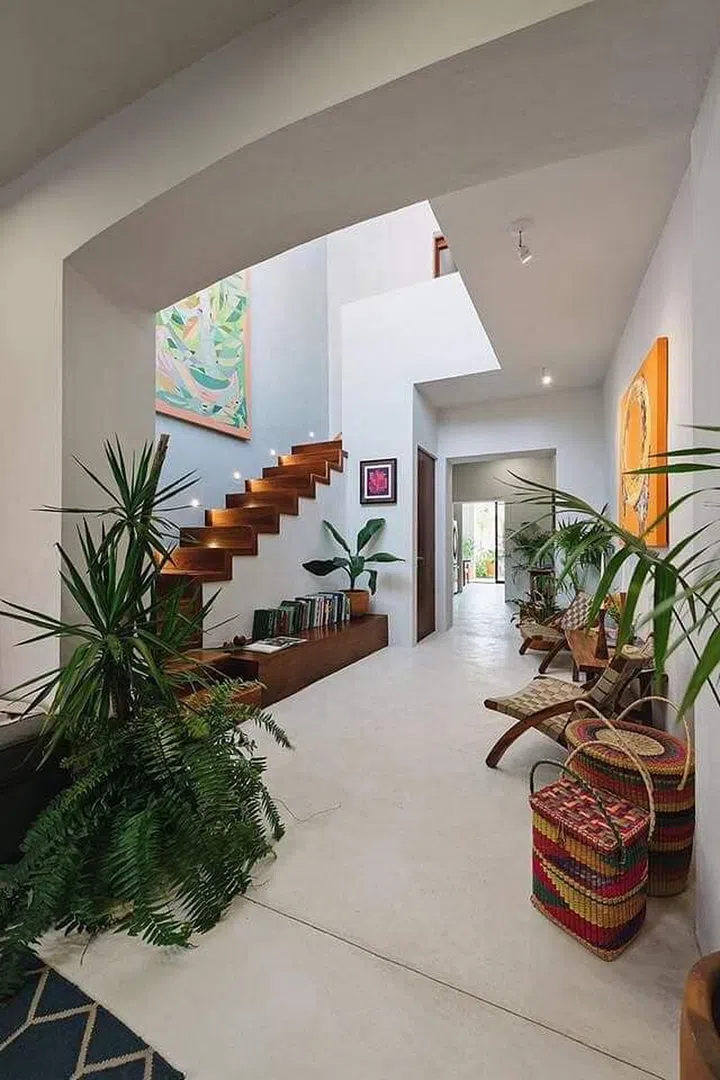 The entrance foyer is anchored by a large rug with a geometric pattern, setting the scene for the rest of the home. There's a sense of vitality and liveliness from the colourful paintings on the walls.