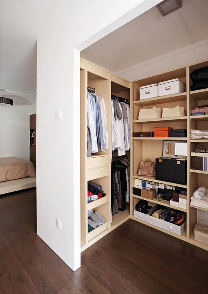 With adjustable shelves, the wardrobe seems made-to-measure for the storage boxes which the couple uses to organise their knick-knacks.
