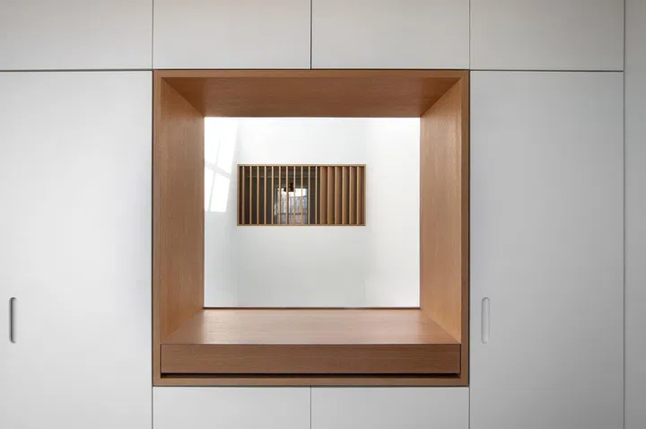 On the other side of the void, one finds plenty of storage space concealed behind the white panels.