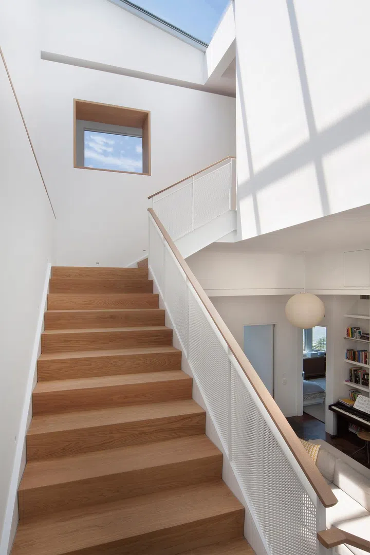 An open skylight exists above the stairwell, allowing plenty of natural light to fill the space during the day.