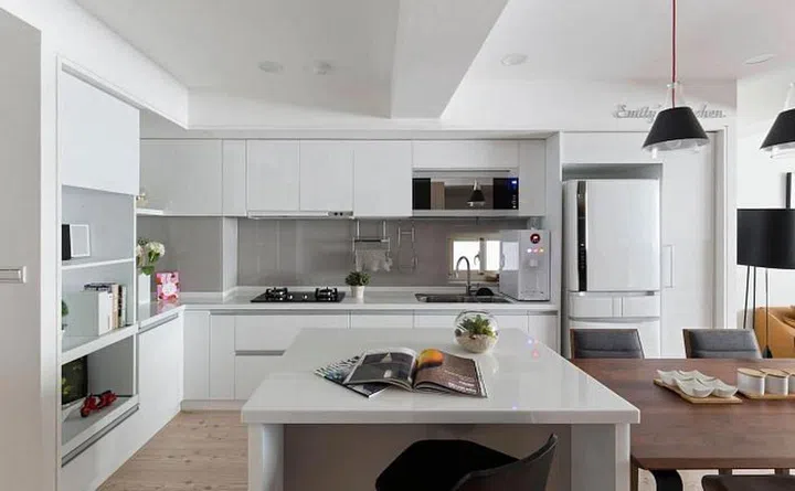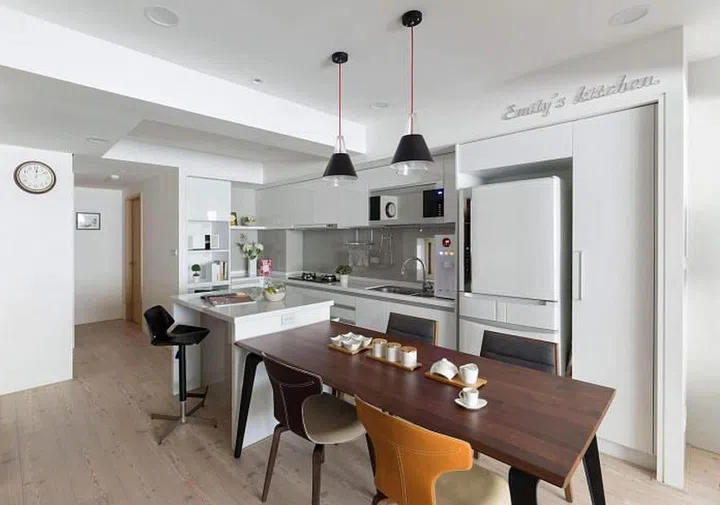The usual practice is to place a dining table next to the kitchen island, this way it extends the space on the island while at the same time also allows the cook to mingle with the diners when dinner is being prepared.