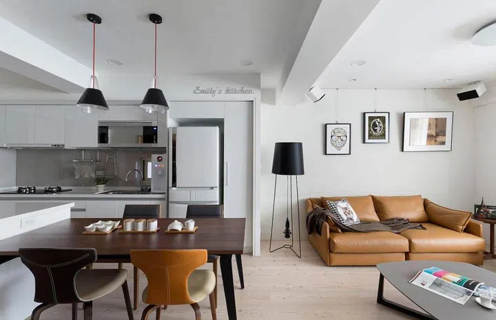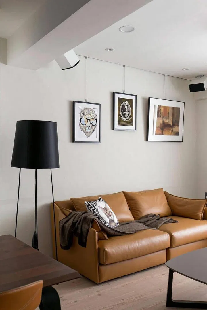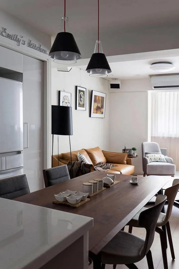 Similarly, the shades of the leather upholstery used in the dining chairs are in the same tone as the sofa.