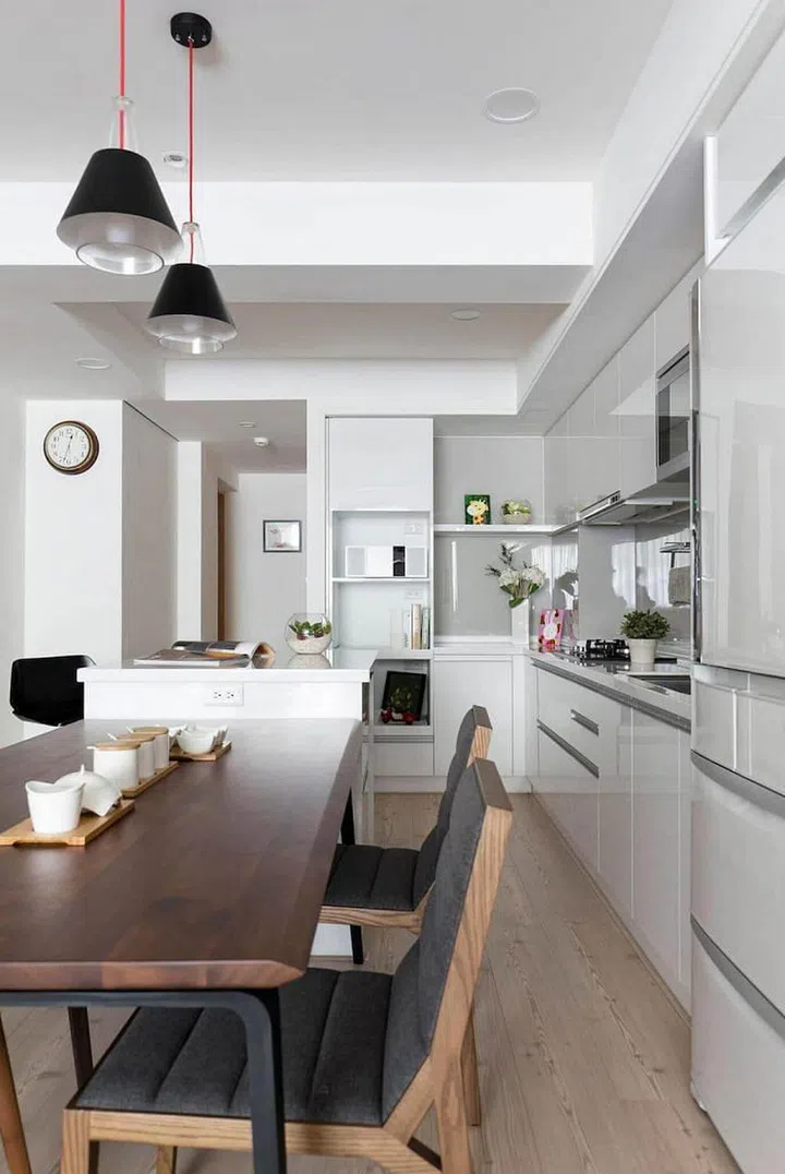 Interior design studio Alphonso Ideas helped the homeowner to maximise the available space in his new apartment by creating an open kitchen in her living room.