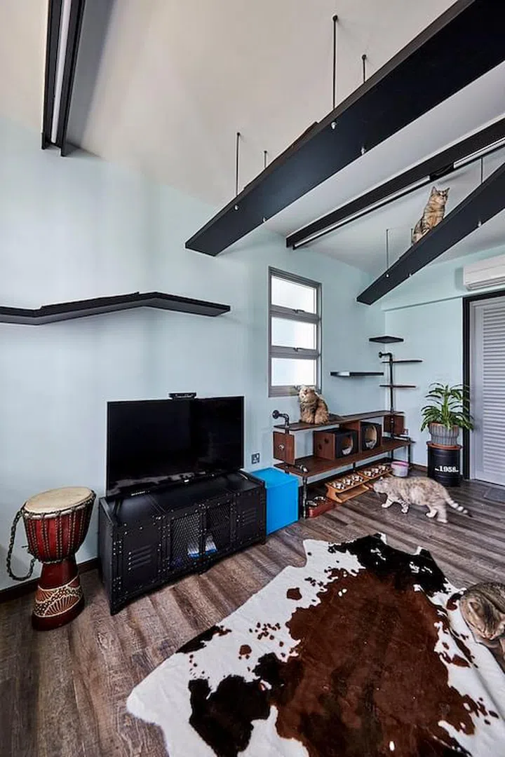 With six cats, Landren also needed to factor in sufficient space and pet-friendly features such as overhead climbing platforms lined with scratching mats to ensure they had various spots for exploration and rest.