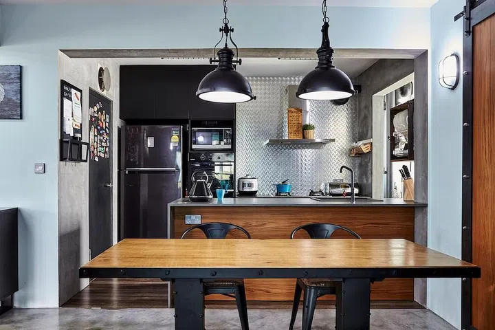 With these requests in mind, Landren Lim, founder and creative director of Mesh Werk Studio, designed a home with industrial-style elements, as well as light blue and mint-hued walls, and some wood-tone finishes.