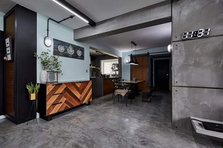 For Irwan Bin Abu Satamin, the raw, “cold” vibe of an industrial interior was something he’d always wanted in his home. His wife Noraini Binte Misnawi preferred a less sterile look with colours for a calming, cosy ambience.