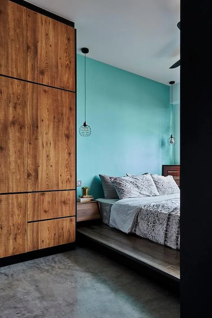 The bedroom is Noraini’s favourite place in the home, thanks to the platform bed she requested, and the refreshing Tiffany blue wall.