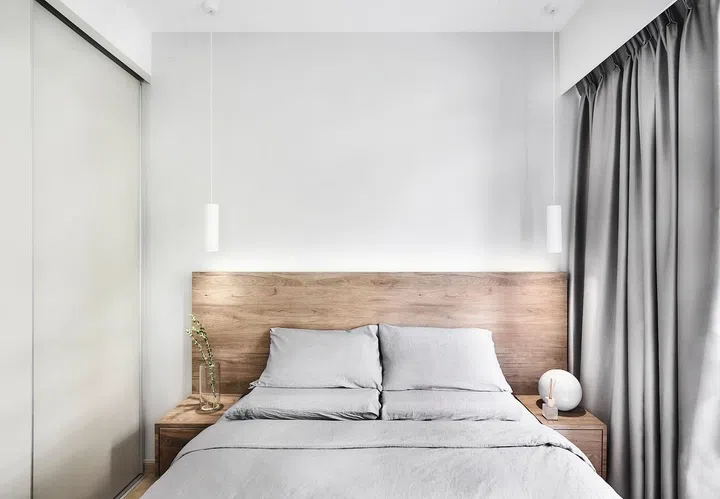 To maximise the space in the master bedroom, Jason designed a built-in wardrobe and bed frame. Curtains, including those in the living room, were also custom made by Alto Fabric.