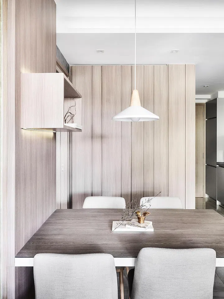 The entire dining area was custom made – from the dining table, to the woodgrain wall and shelf. A durable tabletop from KompacPlus was chosen for its fuss-free maintenance and pretty design for aesthetic flatlay shots. Dining chairs are from HipVan.
