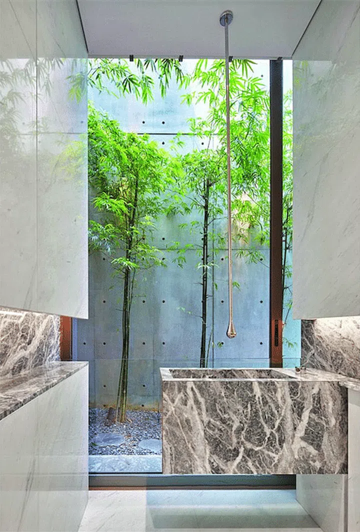 But the owners love the vast, high space and extra windows for light, which allow them to literally bring the garden indoors with a row of trees and shrubs planted in front of the partition wall.