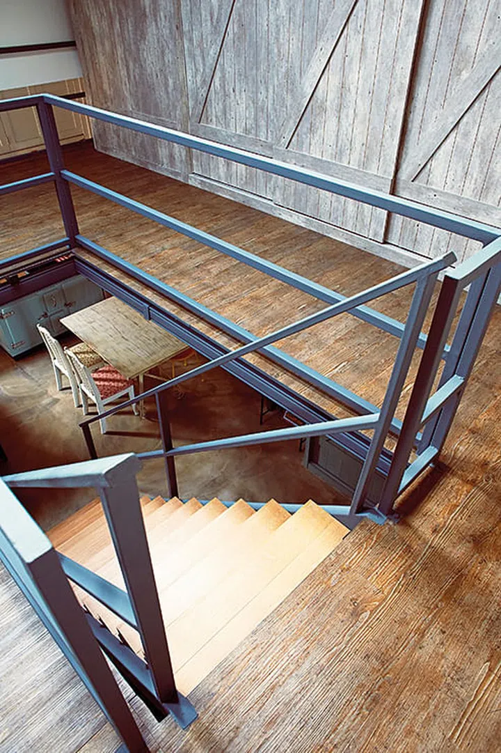 Inspired by old barnyard entrances, Jade had the sliding door to her wardrobe and shoe cabinet crafted in a similar fashion. This statement feature serves as both practical storage and architectural focal point in their bedroom corridor.
