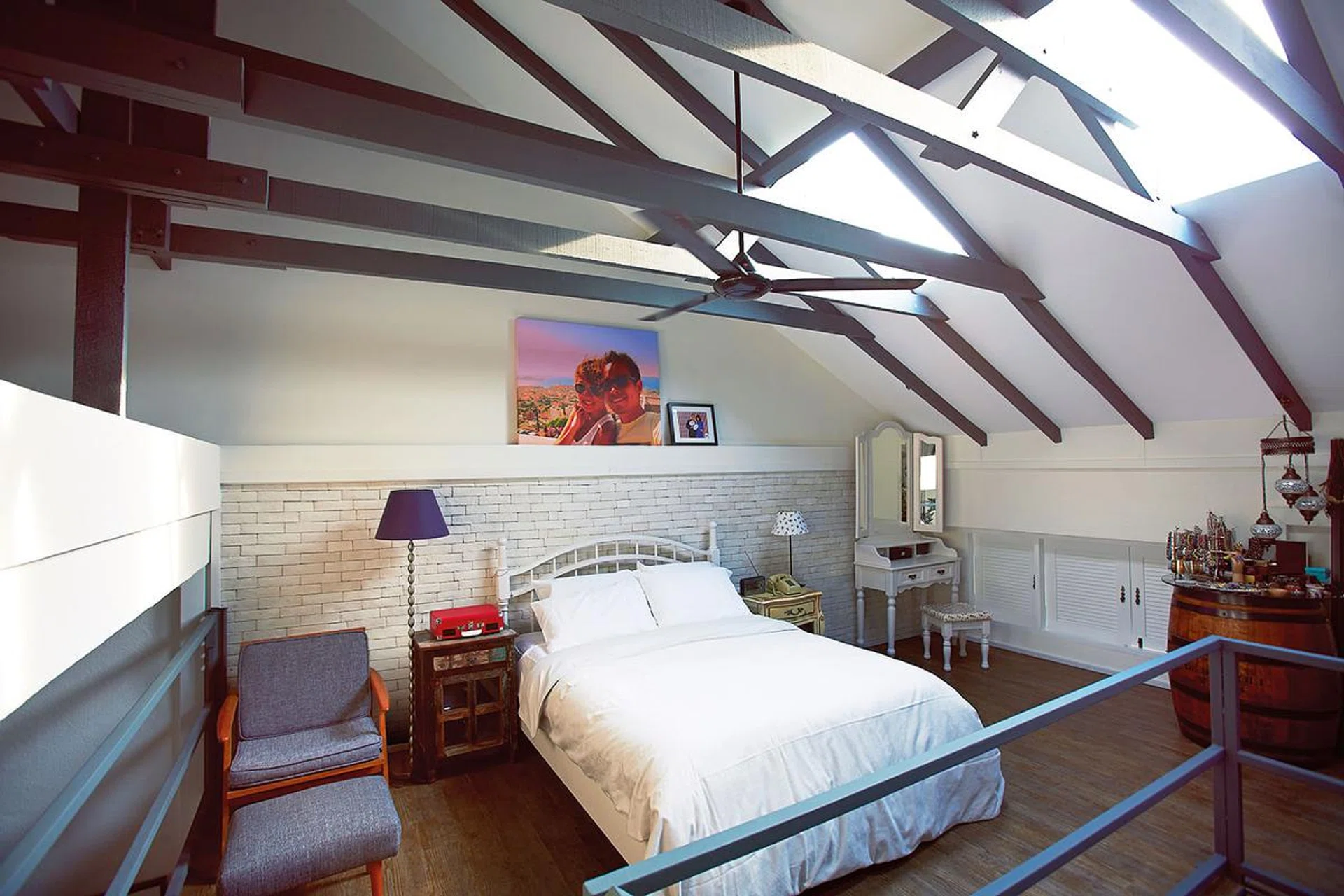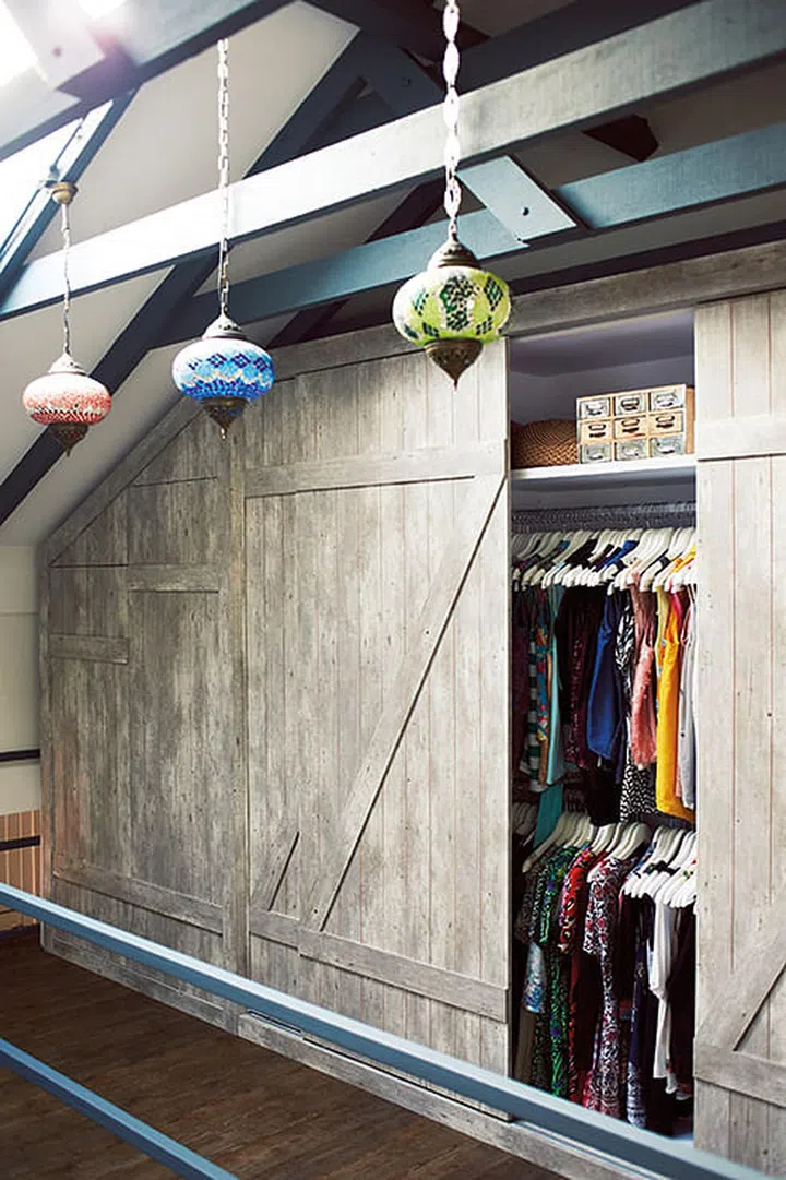 Jade made full use of the slanted space underneath the rafters to house her extensive wardrobe. What might have been awkward architectural constraints in less creative hands have become one of the home’s most charming features.