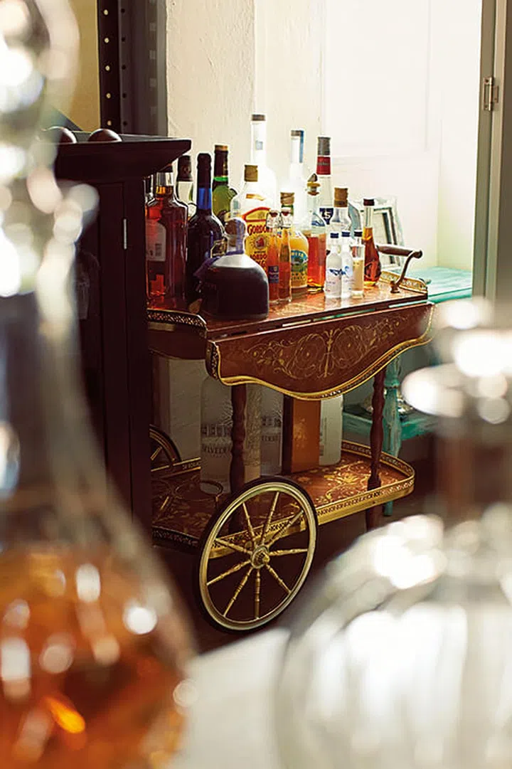 The liquor connoisseurs store their bottles on this vintage drink trolley bought from Etsy. The brass trolley, with its slightly tarnished patina and delicate wheels, adds a touch of old-world glamour to their entertaining space. Like many elements in their shophouse interior, this piece combines form and function in a way that reflects their lifestyle and values.