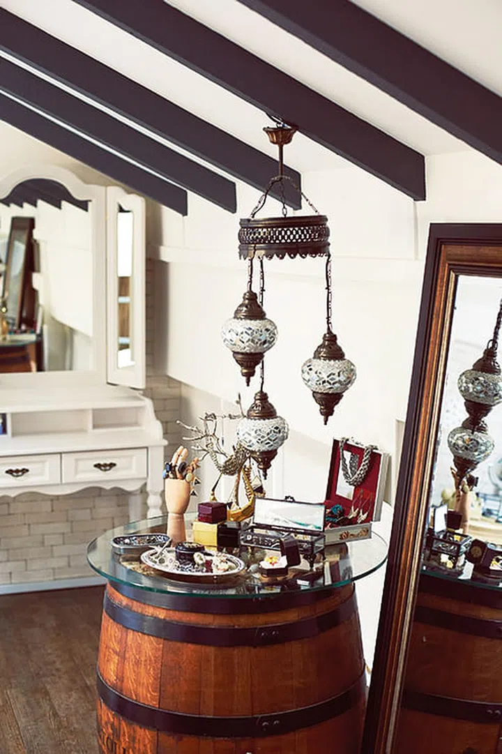 Using a pane of glass, Jade turned an old wine barrel into an accessories table for her bedroom. This ingenious upcycling project perfectly encapsulates her approach to interior design—finding beauty and function in unexpected places. This thoughtful blend of raw materials and refined elements has become a signature of their shophouse style, where every piece tells a story of discovery and transformation.