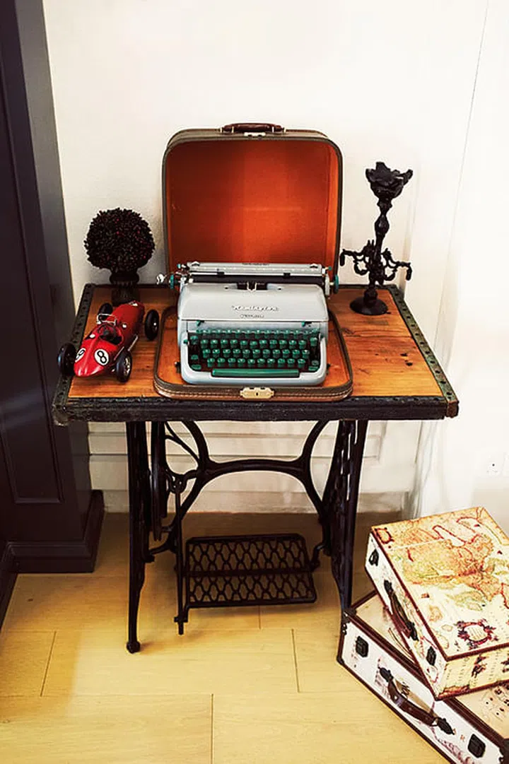 The couple scoured the Internet for unique pieces such as this typewriter and a table made from an old sewing machine. Their dedication to finding one-of-a-kind items extends beyond mere decoration—it reflects their shared philosophy about home creation. These thoughtfully repurposed vintage items bring character to their home that no contemporary piece could match, creating a living space that feels curated rather than designed.