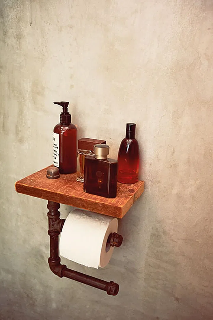 This toilet roll holder was made from metal pipes attached to a piece of wood. Such seemingly small details reflect the couple’s commitment to carrying their vintage-industrial aesthetic into every corner of their home.