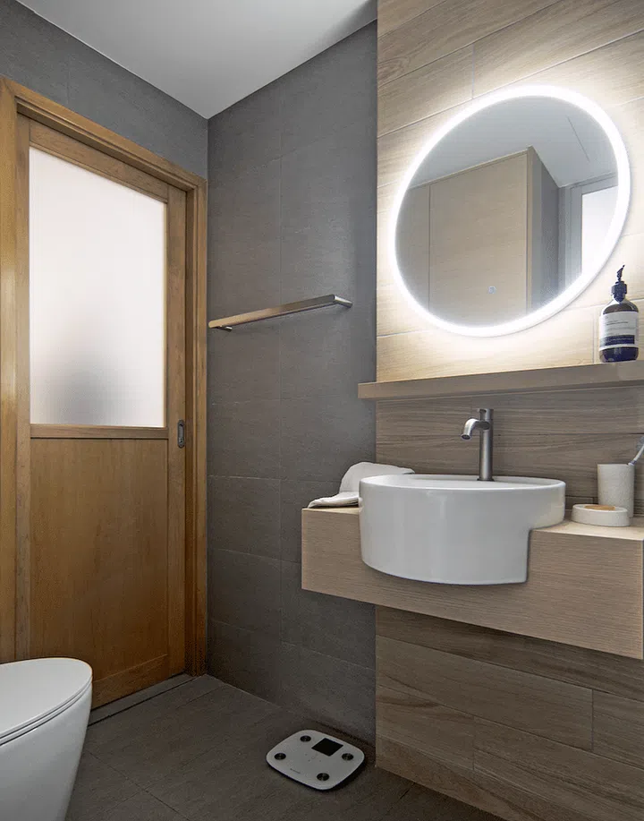 Borrowing inspiration from traditional Japanese bath houses, the walls and floor of the bathroom are laid with stone-look homogeneous tiles and wood-effect porcelain tiles. Contemporary furnishings like an illuminated mirror and metal fittings give it a degree of chic modernity.