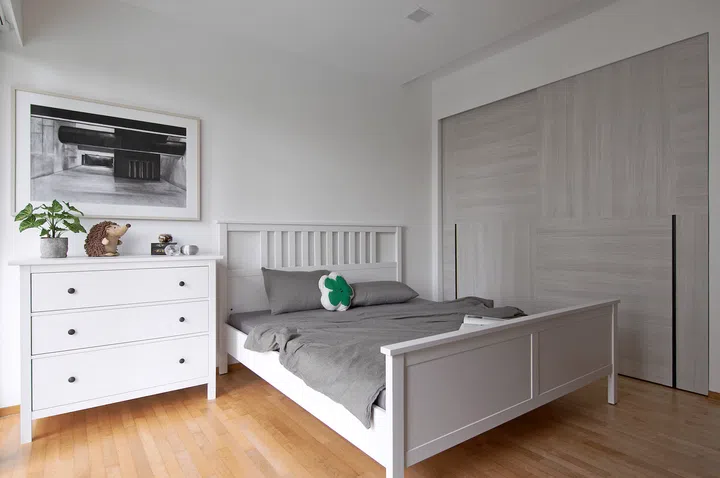 Unlike the rest of the home, the master bedroom veers away from the Zen aesthetic. Instead, it focuses on a simple white, grey and black colour scheme with a classic-meets-modern sensibility. In all, the renovation cost roughly $55,000 and took about six weeks to complete.