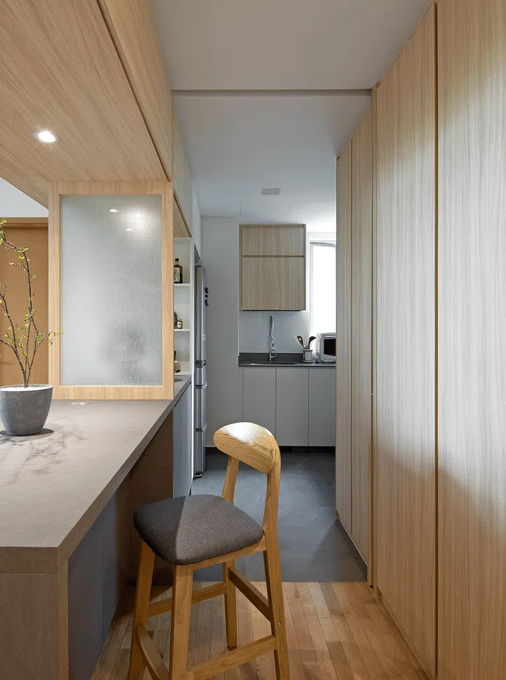 Storage space is a challenge in any small apartment, but KNQ Associates created ample storage with cabinetry cleverly concealed behind panelled walls, like at the kitchen area