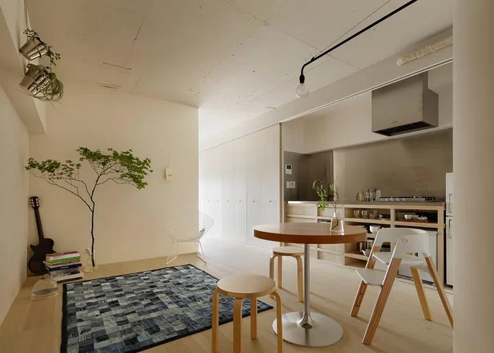 ‘Byobu’ or the traditional folding doors in a Japanese home used to be the way for homeowners to partition parts of the home, and here the designer used folding panels to keep the kitchen area stowed away when not in use.