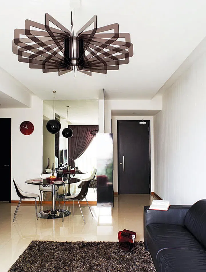 A large black shoe cabinet might have looked heavy and overbearing. So, a tinted mirror was fitted above it to give it a “floating suspended” feel. The mirror not only visually doubles the entry space but also reflects light throughout, creating an atmosphere of expansiveness that belies the actual square footage of this intimate condo.