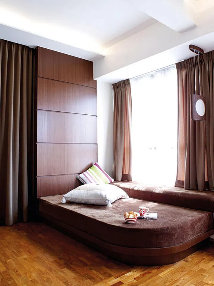 The spacious upholstered settee on a raised platform doubles as a cosy study corner, so there’s no need for a “formal” study area or bulky desk. The elevated platform visually separates this area from the surrounding space, creating a distinct zone without requiring walls or partitions that would diminish the openness of the compact condo floor plan.