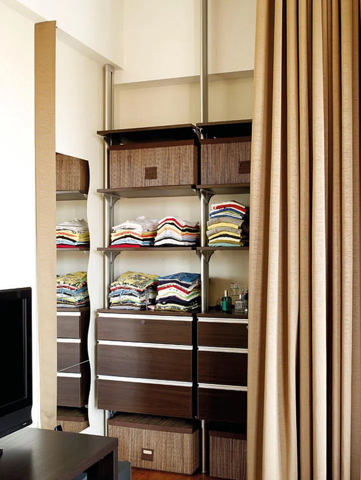 The walk-in wardrobe is hidden by a curtain — a clever alternative to wardrobe door. When drawn closed, the flowing fabric creates a sense of mystery and softness; when open, it reveals an impeccably organized storage system that keeps daily necessities accessible yet concealed.