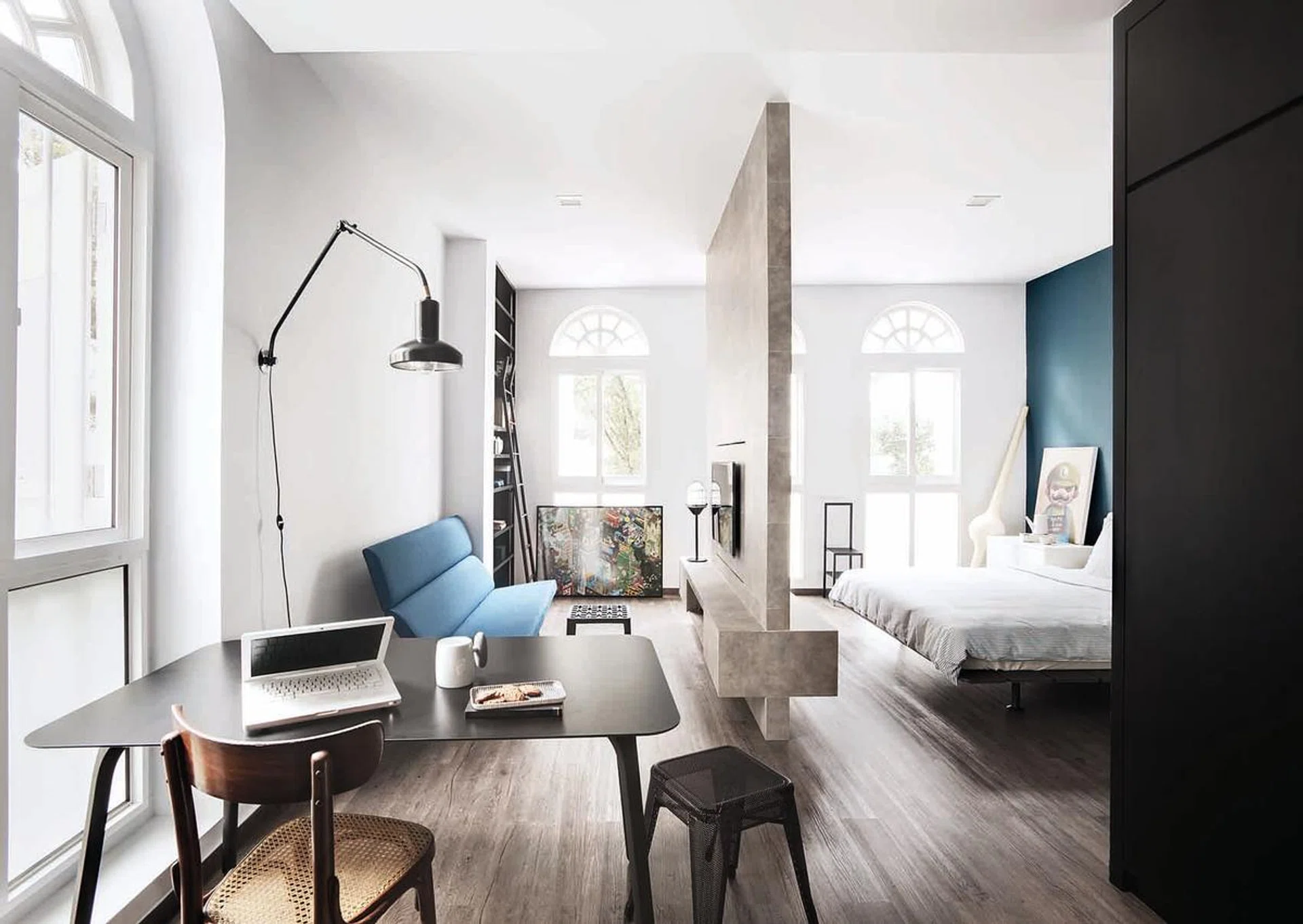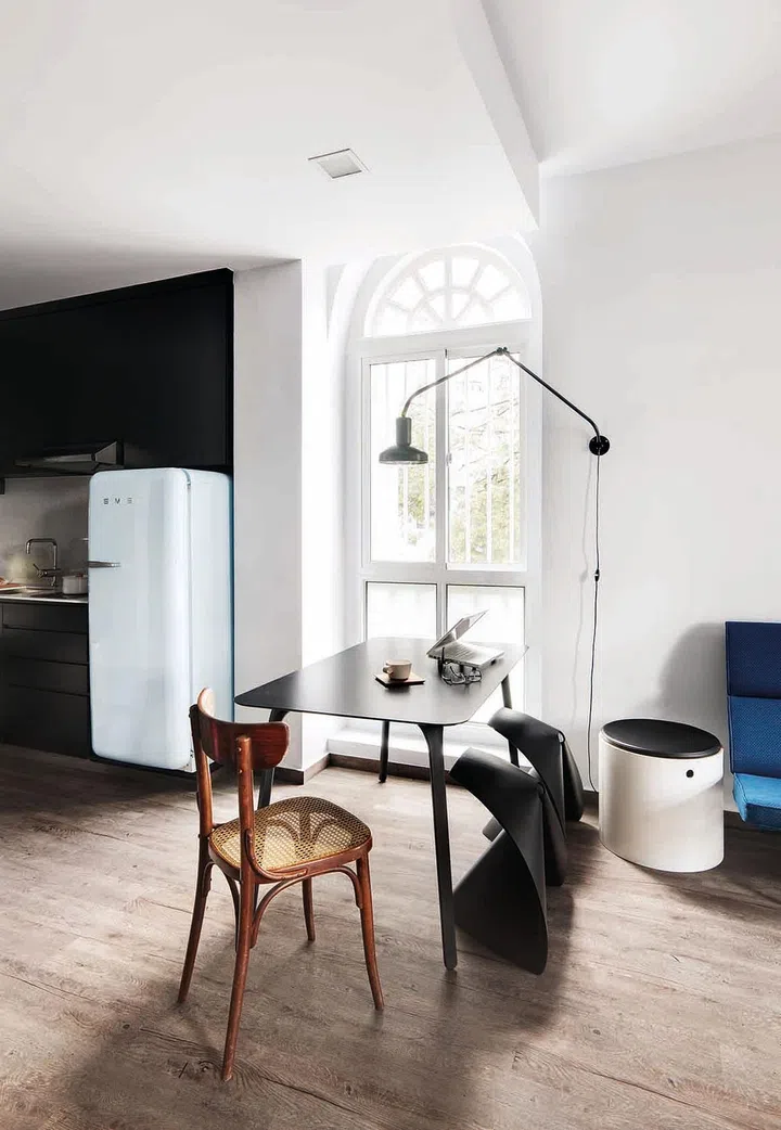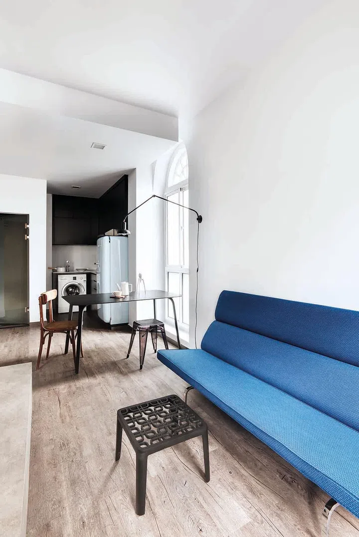 Despite its compact size, the home defies expectations of feeling claustrophobic, thanks primarily to the traditional shophouse windows that front the apartment. These architectural gems bring in abundant natural sunlight, creating an sense of openness and connection to the outside world that belies the limited square footage.