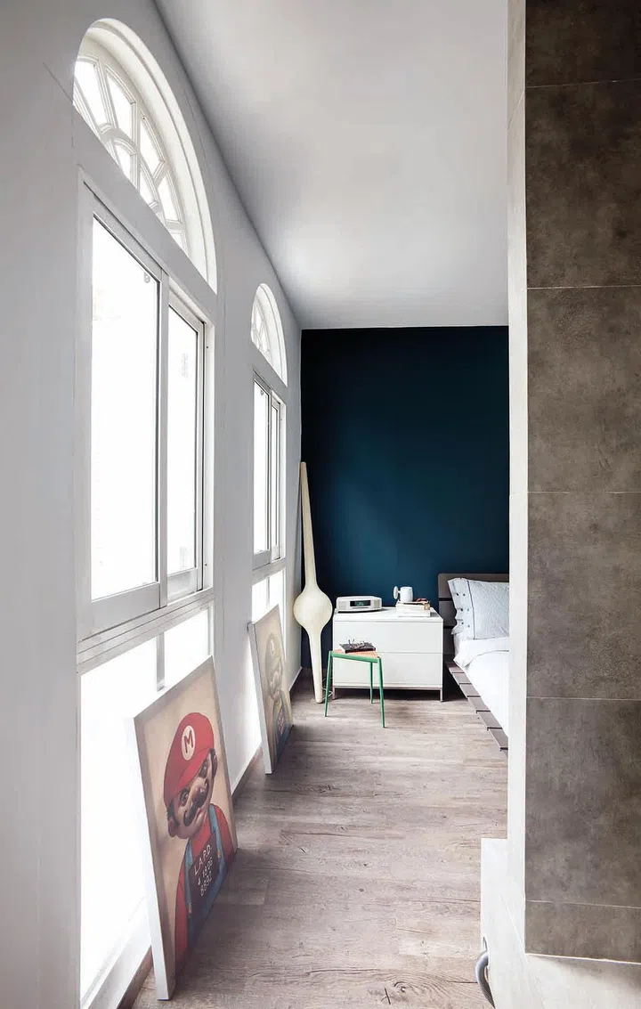 The windows not only provide illumination but also serve as a reminder of the building’s historic character, bridging contemporary living with architectural heritage.