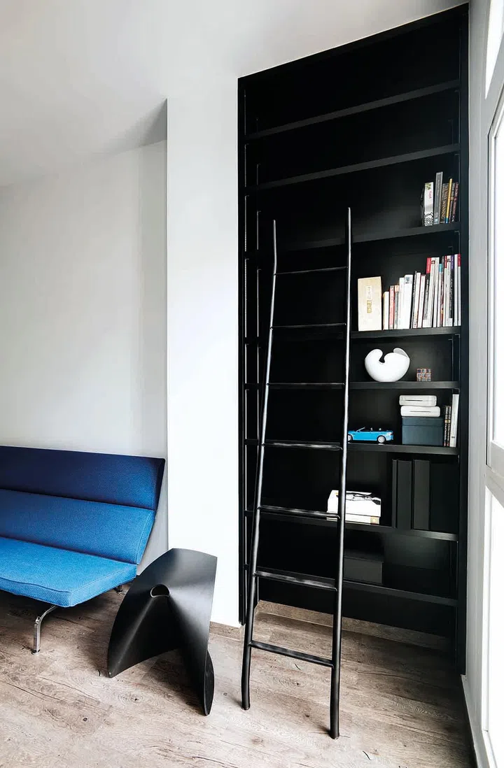 The home’s storage solutions reveal remarkable creativity. A former wall niche has been transformed into a bookcase with adjustable shelves, turning an architectural quirk into a functional design feature. Rows of additional shelves are cleverly hidden behind a customized tall cabinet that also serves to store shoes and clothes, ensuring that every inch of space is utilized without creating visual clutter.