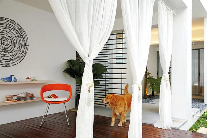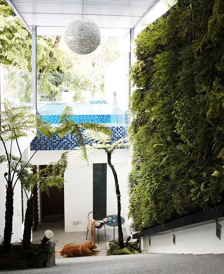 The innovative design of this corner terrace on Meng Suan Road pays tribute to its surroundings. Architect Tsok Wui Chong of MD.MA Design Consultants opened the home to the outdoors but retained requirements for privacy (and air-conditioning) with design that blurs the boundary between the interior and exterior and creates new, surprising spaces for living. Green walls provide a novel and aesthetically pleasing solution here. Outdoor furniture, from Air.
