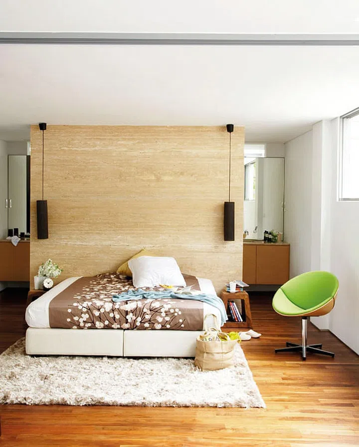 In this master bedroom, the sleeping space, wardrobe area and bathroom are fluid zones, not cellular compartments. Chair and throw, from Style:Nordic.