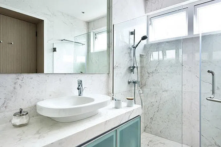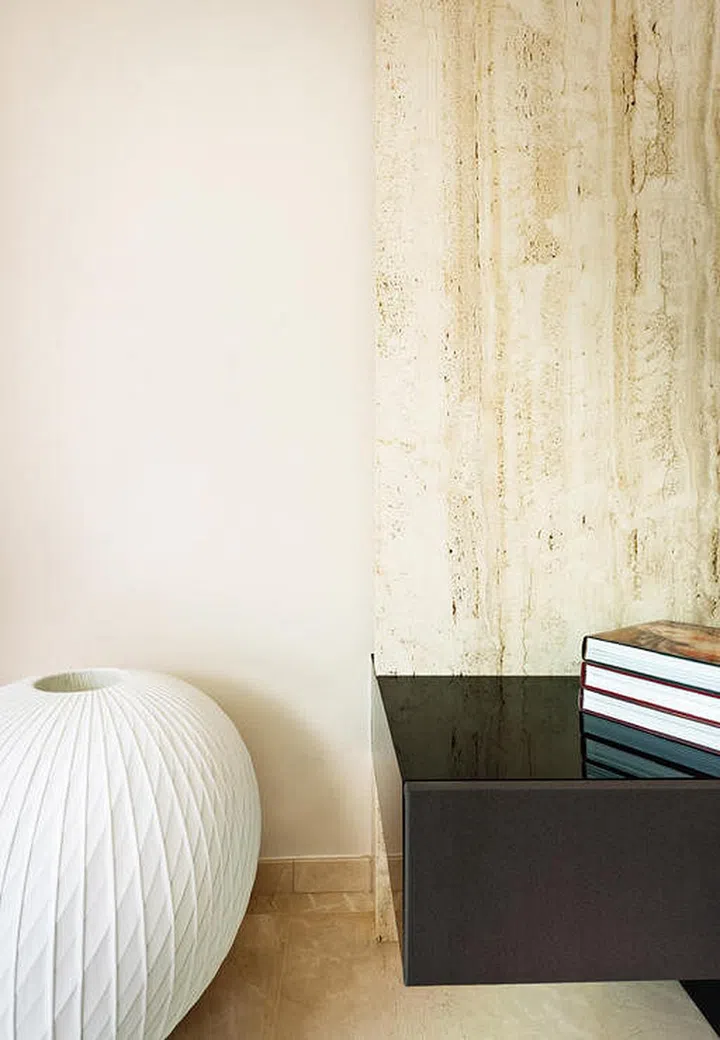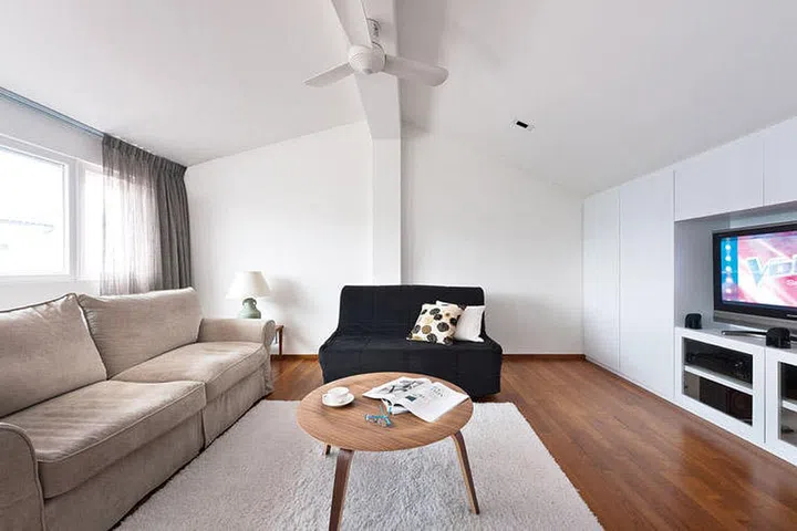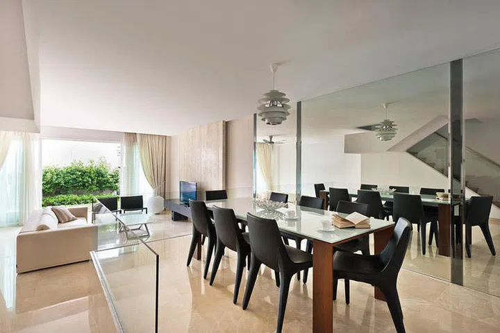 A controlled and sophisticated color palette became the foundation of the interior design. Neutral tones and pristine white were carefully selected to create a soft, universally appealing environment. The ground floor showcases the elegant crema marfil marble imported from Spain, adding a touch of luxurious restraint to the Siglap terrace house. This deliberate design choice allows the architectural elements and natural light to take center stage.