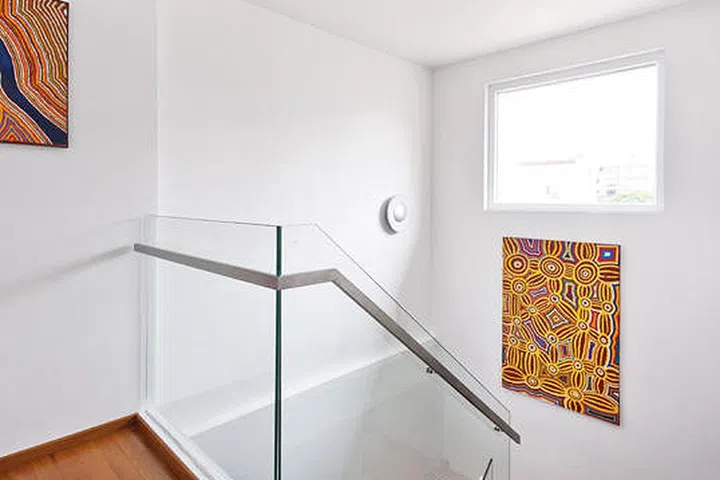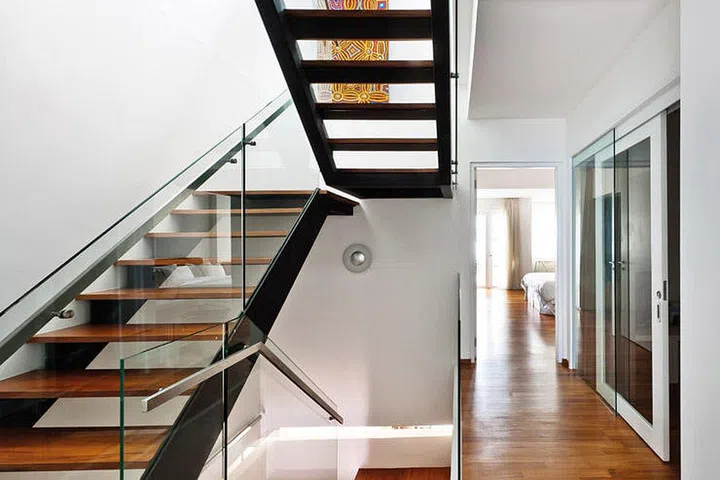 Natural light emerges as a defining characteristic of the home’s design. A strategically placed skylight in the roof and a slim horizontal opening along the bottom flight of stairs flood the stairwell with abundant, soft illumination. Glass railings and a fixed panel window further amplify this luminous quality, ensuring that brightness permeates every corner of the house.