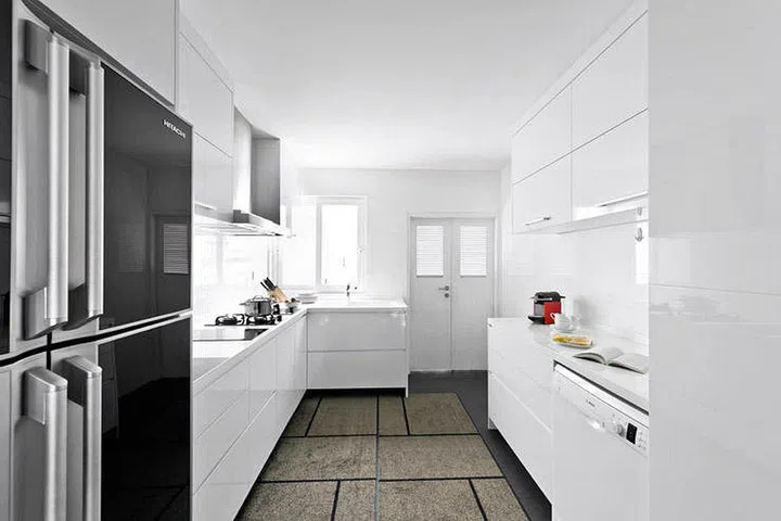 The galley-style kitchen, visible from the dining area, maintains a basic and uncluttered design that complements the overall minimalist aesthetic. This approach ensures that the kitchen feels integrated yet unobtrusive.