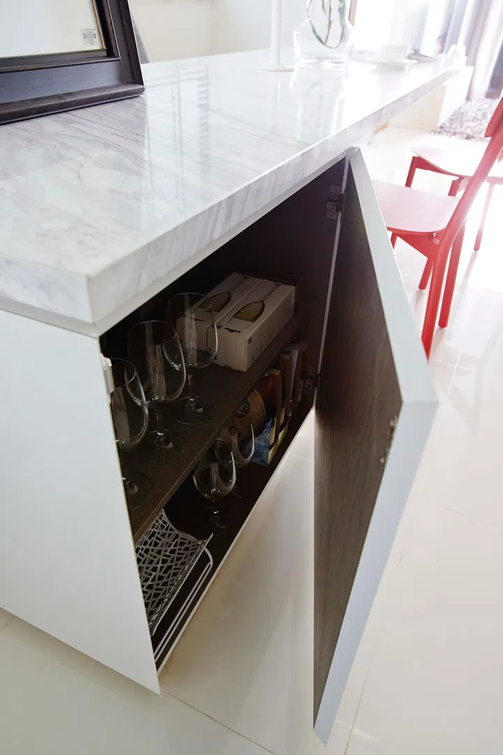 This dining table leg hides practical storage for wine glasses and drink bottles, and is especially useful while entertaining.