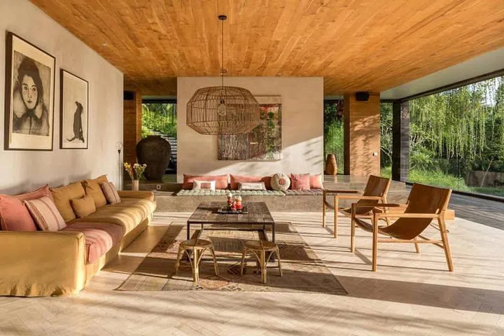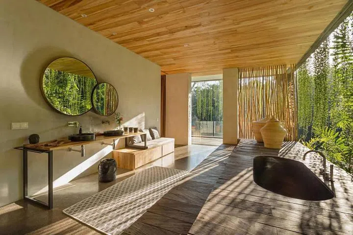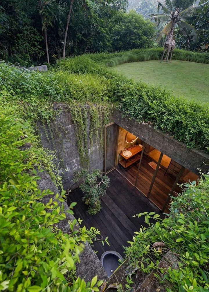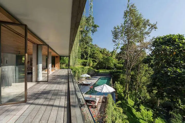 This luxurious villa hidden amidst the hills and valleys of Bali is open-concept and surrounded by lush greenery.