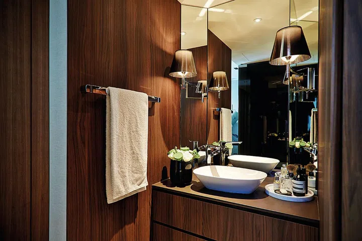 All the sanitary fittings in the bathroom are by Patricia Urquiola for Hansgrohe, and the sanitaryware is from the Palomba series by Laufen. Creating a sense of continuity, the wood panelling from the communal areas extends to the bathroom.