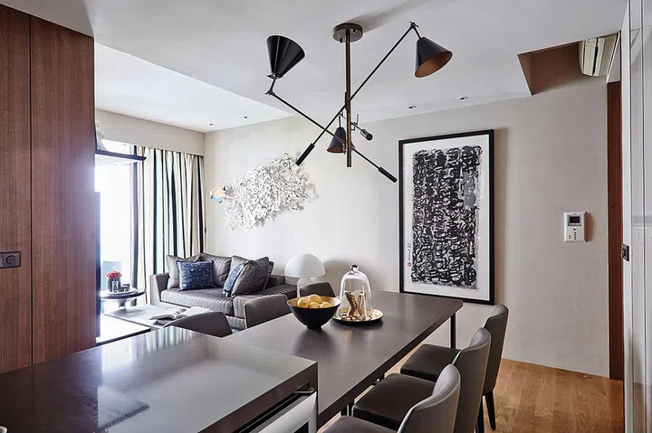 The bright, open living and dining space is a design emporium. The sofa is Minotti, and the two iconic lamps featured are the Atollo table lamp by Oluce and the Sinatra pendant by Delightfull. The framed Chinese calligraphy is by renowned Singapore artist Lim Tze Peng.