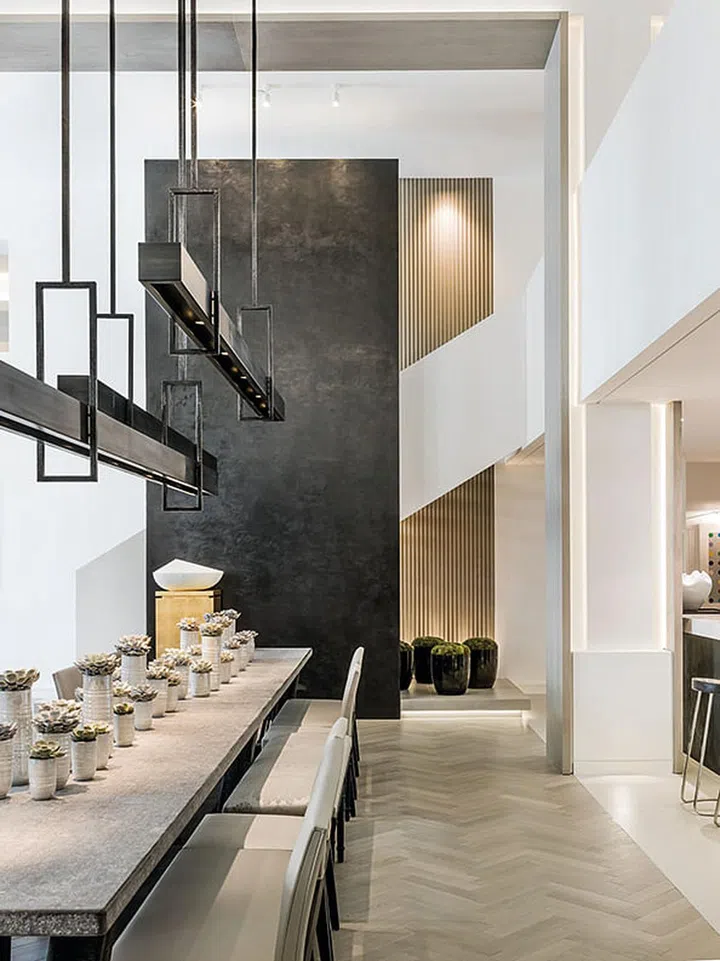 Instead of chandeliers, two bars filled with downlights help to cast an atmospheric glow onto the dining table below.