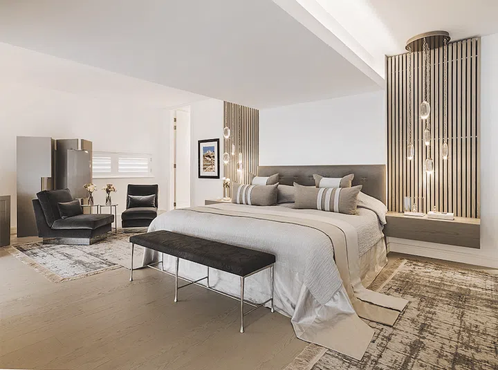 Adding symmetry to the room are bedside lamps from Ochre against a backdrop of ribbed panels flanking either side of the bed.